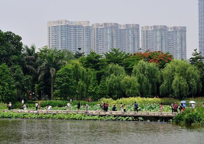 廣州東山湖公園以湖為主,以堤岸組成游覽干線,北堤種植細(xì)葉榕,中堤種植蒲桃、垂柳、紅花紫荊。湖中有4個半島和2個小島.分別以九曲橋、落虹橋、拱橋、五孔橋及三曲橋相連,每逢春暖花開,桃紅柳綠,景色優(yōu)美,湖面碧波蕩漾,花木繁茂。故曾被評為羊城新八景——東湖春曉。