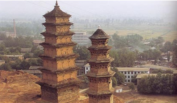 華嚴寺是中國佛教華嚴宗的祖庭。華嚴寺由初建到以后數百年間,無高大殿堂建筑的記載,而只記有鑿原為窟,以安置佛像及僧眾居住,華嚴寺可以說是黃土高原上一座典型的窟洞寺院。從塔的記載看,這里曾有華嚴宗初祖杜順坐定身骨的墓塔、二祖智儼塔、三祖賢首塔、四祖澄觀塔。但在清乾隆年間,發生了少陵原崩塌事件,僅存磚塔兩座,其余全毀。一九三0年陜西大旱,朱子橋居士來陜西賑災,與佛教界人士瞻禮華嚴寺塔時,見到元代重修碑內有"修塔即降甘露"的文句,便于塔前發愿"重修兩塔,祝愿普雨"。不日即天降大雨,朱子橋遂與佛教界人士動工修塔。