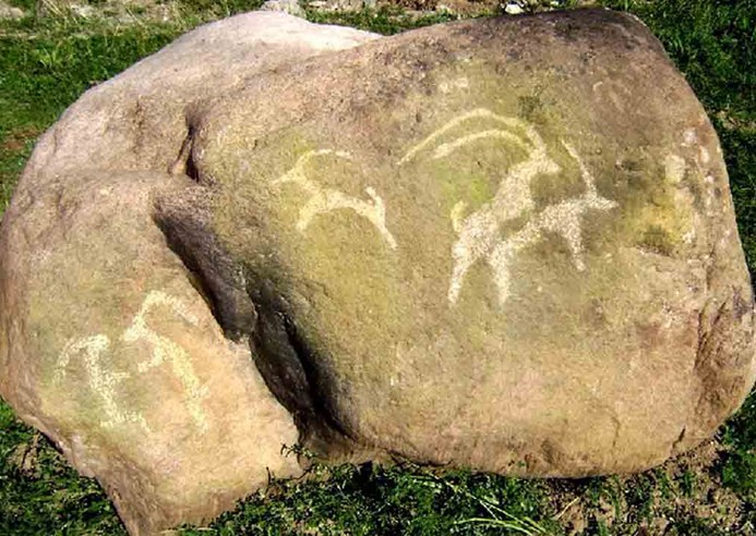 魯芒溝巖畫位于天峻縣天棚鄉之西南,溝為東南-西北向,溝口處有西寧-天峻公路橫穿,溝東西兩側均為高山,山間和溝谷間牧草叢生,為良好的天然牧場。在溝內約4公里處東側為石山,石山根部為山體潰塌而落下的大石塊,這些石塊表面有一層油黑發亮的氧化面,巖畫就制作在這些大石塊上,共有3處,分別刻在3塊相距不遠石面較平的大石塊上。