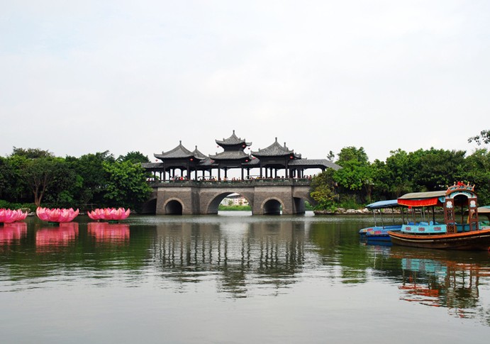 粵暉園布局精妙,將嶺南園林傳統藝術與現代審美情趣融合于一園。樓館、亭臺、水榭、曲廊、石橋、假山等一百零八個園林景點,蘊含著清雅別致的嶺南古建筑風格,掩映于青翠欲滴的古樹名木之間,曲徑通幽,步移景異。一條條清凌凌的小河在園中回環縈流,將園內各景點串聯起來,水隨園轉,園因水活。庭院深深,荷風四面,楊柳輕垂,極具唐詩宋詞之深遠意境。嶺南園林與北京的皇家園林(頤和園)、蘇州的江南園林(拙政園、網詩園等)并稱中國古典園林三大體系?;洉焾@是嶺南園林的代表杰作,是全國最大的私家園林?;洉焾@布局精妙,將嶺南園林傳統藝術與現代審美情趣融合于一園。樓館、亭臺、水榭、曲廊、石橋、假山等108個園林景點,蘊含著清雅別致的嶺南古建筑風格,掩映于青翠欲滴的古樹名木之間,曲徑通幽,步移景異。一條條清凌凌的小河在園中回環縈流,將園內各景點串聯起來,水隨園轉,園因水活。庭院深深,荷風四面,楊柳輕垂,極具唐詩宋詞之深遠意境。園內巧引東江之天然活水,河、湖、溪、澗等水域面積240多畝,約占總面積百分之三十,碧波蕩漾,極盡婉柔。蘩文館是園中的主體建筑,面積一萬多平方米,為嶺南仿古樓閣之冠,珍藏著嶺南文化藝術瑰寶。南韻館則是古典劇場,可聆聽傳統粵曲的天籟之音。五元坊、詩廊、歸水橋等眾多景點,工藝精湛,富于嶺南文化氣息。