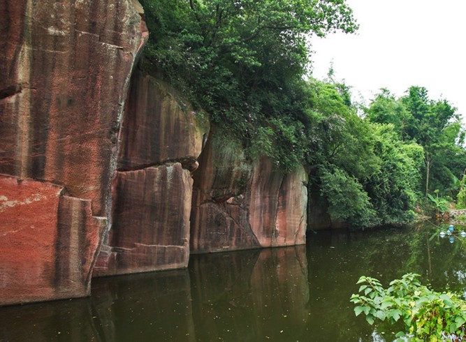 燕嶺原是東莞這里明清時期的古采石場,有些象廣東最著名的蓮花山的形成原因,樣子也很象。石料為水成巖紅石,經數百年開采殘留下來許多的石壁、石柱,呈暗粉紅色,當地人稱之為"十八間房"。