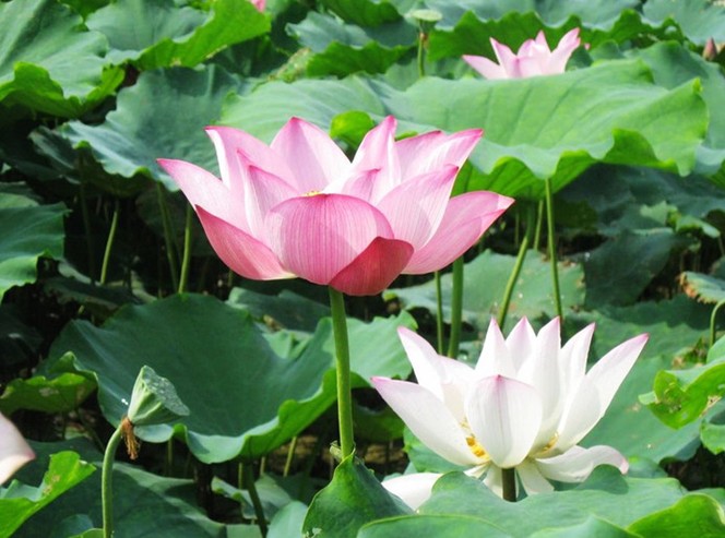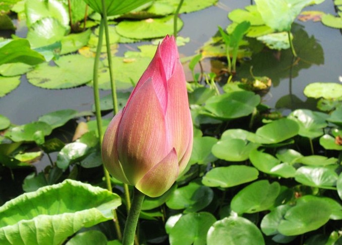 站在青石砌成的觀賞臺上,憑欄而觀,仿佛是綠波蕩漾中的一葉小舟,在此起彼伏的一片荷海中,隨波輕漂,粉霞點點,宛如天成的錦繡。怒放者有之,含苞者有之,傲然挺立者有之,含羞隱藏者有之,形態各異,各種風姿盡收眼底。
