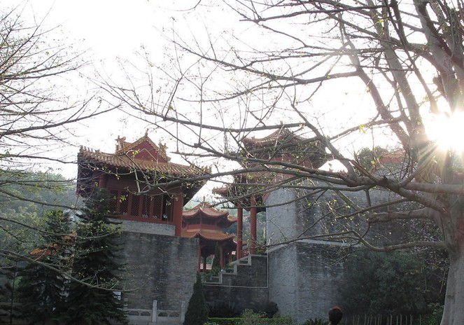 矗立在天后宮廣場巨大的天后石雕圣像,用 365 塊花崗巖石砌成,象征著天后娘娘在一年 365 天中都保佑著風調雨順、國泰民安。在廣場中央我們可以清楚地看到一條中軸線,南沙天后宮的建筑物都是依據這條中軸線而建造的牌坊原全國宗教協會主 席趙樸初 先生生前為牌坊題詞。穿過牌坊便到達山門。山門是天后宮的正門,室內供奉是“千里眼”和“順風耳”這兩尊像神。南嶺塔塔高45 米 、共8 層。。與此同時,這塔的層數是 8 層,之所以是雙數,與其它塔單數的不同,是因為民間傳說中有這么一條不成文的規定,即男神仙的代碼是單數,女神仙的代碼是雙數。天后是女神,因此天后宮內,無論是階梯、瓦楞還是對聯的單聯(上聯或者下聯)字數,都是呈雙數的。山門是南沙天后宮的正門,門內殿堂左右兩側分別站立著千里眼和順風耳的塑像,傳說他們被天后收服,成為給魚民預報海浪風濤信息的神靈。與鐘鼓樓相比粼的是碑亭,明成祖[御制弘仁普濟天妃宮碑]及鄭和[天妃靈應之記]碑,分立其中,兩碑文記述了明三寶太監鄭和屢受天妃庇佑.完成七下西洋壯舉的經歷. 獻殿在山門的正上方,殿中供奉官服天后立像,但見四海龍王執圭在兩旁站班,顯示出天后作為海上女神的領導地位.使用宋代對天后褒封封號命名的靈惠樓,嘉應閣,位于正殿與獻殿之間的兩側,這是天后文化的交流處所。山門兩側有鐘樓和鼓樓。鐘鼓樓內的鐘和鼓都按時敲擊。每逢節慶期間,這里更是鐘鼓齊鳴,一派喜氣洋洋的氣氛。