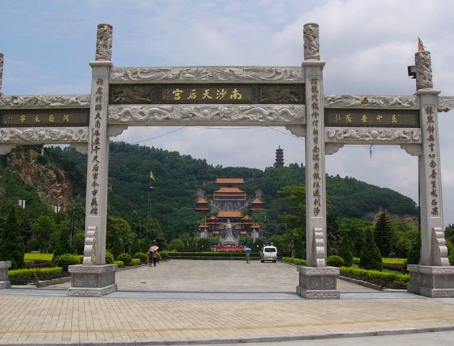 南沙天后宮,緊臨珠江出海口伶仃洋,坐落于大角山東南麓,依山傍水,其建筑依山勢層疊而上,殿宇輝煌,樓閣雄偉,在天后廣場正中就是石雕天后圣像,是為紀念海上女神林默而建,建筑特點是集北京故宮的風格和南京中山陵的氣勢于一體,其規模是現今世界同類建筑之最,被譽為“天下天后第一宮”,也是東南亞最大的媽祖廟。天后圣像高達14.5 米,屹立在天后宮廣場正中。