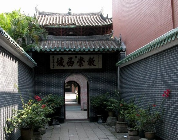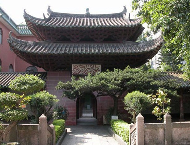 懷圣寺又名獅子寺,俗稱光塔寺,是中國(guó)四大古代清真寺之一,也是我國(guó)現(xiàn)存最古老的清真寺建筑。位于越秀區(qū)光塔路56號(hào),被列為廣東省省級(jí)重點(diǎn)文物保護(hù)單位。唐、來以來,廣州為我國(guó)海外貿(mào)易的主要港口,那時(shí)廣州的阿拉伯富商最多,他們?cè)诋?dāng)?shù)卣闹С窒拢藿艘蛔?guī)德宏大的清真寺,即今日的懷圣寺,寺的命名表達(dá)了中外教民對(duì)圣人穆罕默德的尊從和懷念。該寺禮拜大殿置于院庭的正面,它是3間帶周圍廊、歇山重檐綠琉璃,帶斗拱的古典式建筑,巍然聳立在帶雕石欄桿的大平臺(tái)上,充分顯示了大殿的高貴威嚴(yán)、石欄桿板上的雕刻各異,有葫蘆、扇子、傘蓋、花卉、獅子、游魚等物,極為活潑生動(dòng)。大殿內(nèi)部潔白明亮,用木地板及三面拉門,殿內(nèi)裝飾雖少,但很整潔大方。