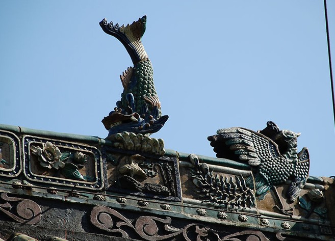 大殿是南海神廟的第四進(jìn)。它是仿明代木結(jié)構(gòu)琉璃瓦歇山頂建筑。屋頂用綠色的琉璃瓦覆蓋;中間有雙鳳飛翔、鰲魚倒懸等紋飾的琉璃瓦脊;上部有兩條軀體彎曲作騰飛疾走狀的蒼龍?jiān)煨停跔帄Z當(dāng)中的寶珠。據(jù)說,雙鳳代表美麗,整魚代表自由,蒼龍代表權(quán)力,而寶珠代表智慧。