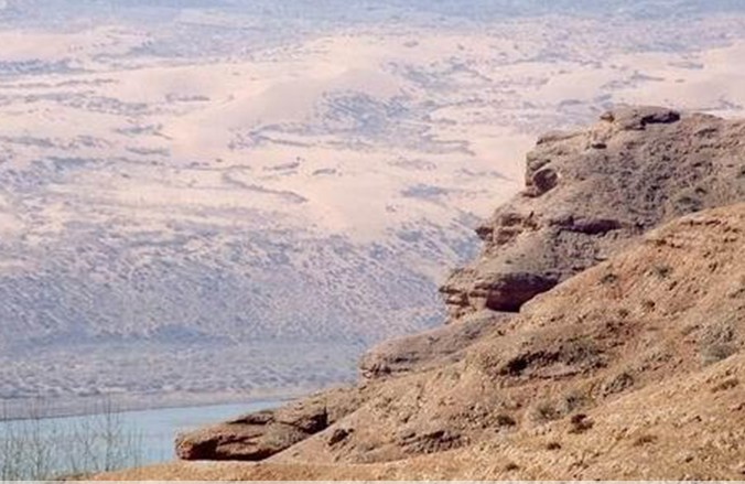從沙坡頭乘快艇穿越黃河抵達河對岸的“q”形島,穿過大灣村向南迤邐而上,登上一座建有涼亭的小山包,放眼西望,但見500米開外,有一處紅褐色的小山包群,與周圍的沙丘和灰褐色山體形成了強烈的反差。 這紅褐色的山包群南側臨河處有2座突出的山頭,注目遠眺,但見一對雄雌雙獅豁然躍入眼簾:突前的一塊山巖分明是雄獅大而圓的鼻子;往上是棱角分明的眼眶和一雙乍醒徽啟的眼睛;再往上直到山頭的頂部,仿佛是扁平的額頭和卷屈飄逸的毛發。