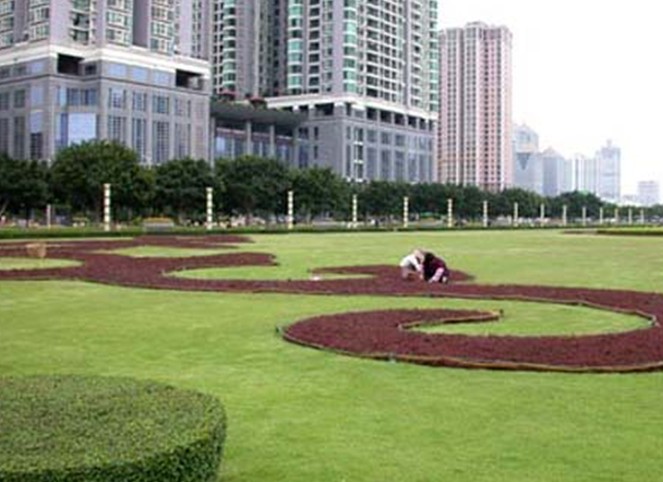 天河?xùn)|站綠化廣場位于廣州市新城市軸線上,占地面積4.7萬平方米,于1998年9月中旬動(dòng)工,1999年7月1日正式完成并交付使用。廣場中央綠地2.6萬平方米,鋪種馬尼拉草18315平方米,其中有6000平方米種植標(biāo)志性的紋樣,分圍種植1300平方米的福建茶綠籬。