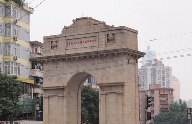 陵園有一座花崗巖砌成的仿羅馬紀功式建筑凱旋門。門樓建于1932年,位于沙河頂、先烈路和水蔭路的交會處,高13.4米,寬 11米,占地面積 40.7平方米。門額正面鐫刻著原國民政府主席林森所題的“十九路軍抗日陣亡將士墳園”,背面鐫刻國民政府行政院長宋子文題寫“碧血丹心”。