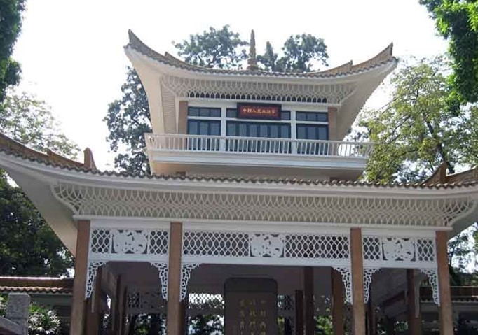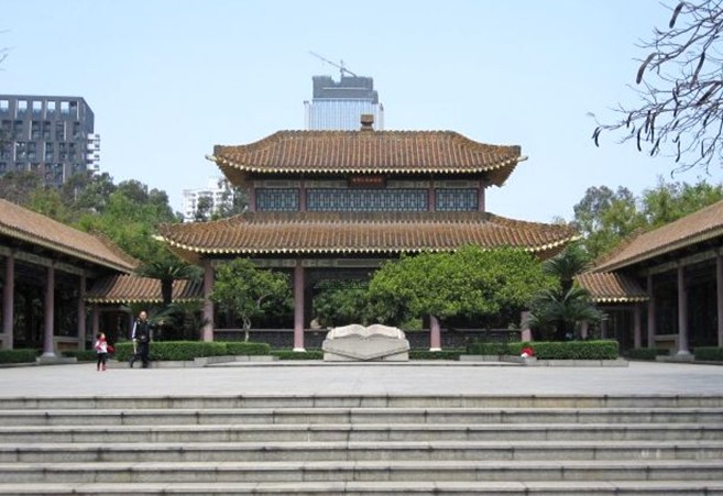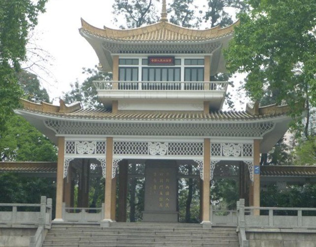 中朝人民血誼亭位于廣州起義烈士陵園內東面,與中蘇人民血誼亭相對。建于1964年,坐南朝北。建筑平面呈“凹”字形,占地面積約3000平方米。黃色琉璃瓦,鋼筋混凝土結構。主亭面闊三間12.85米,進深三間13.06米,高二層,四角攢尖頂。上懸“中朝人民血誼亭”匾額。兩側各有總長為33.7米的曲尺型長廊,兩廊各連接面闊6米,進深5.5米的卷棚歇山頂副亭,平面呈方形。中國傳統形式的建筑基座,帶有朝鮮民族風格的屋脊和檐口裝飾為金達萊花和木棉花結合的圖案。亭前是水池,小橋橫跨其中。亭中心矗立著高大的花崗巖石紀念碑,碑座高0.96米、碑身高 4.3米、闊2.6米,上嵌紅棉圖案。紀念碑正面刻“中朝兩國人民的戰斗友誼萬古長青”, 版權所有山東聊城聊之旅國際旅行社有限公司,轉載必究!落款為“葉劍英”,題于“1964年十月一日”。背面鐫刻著著名書法家吳子復書寫的碑文,對在廣州起義中犧牲的朝鮮青年的事跡作了簡明的介紹。