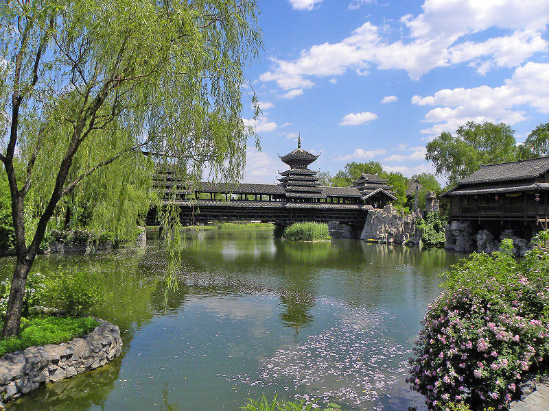 北京中華民族博物院(中華民族園)民族大橋于2000年11月竣工,版權所有聊城聊之旅旅行社有限公司,轉載必究!總設計師為北京中華民族博物院(中華民族園)院長王平女士。橋長65米,高16米,寬8米,分上下兩層,將北京中華民族博物院(中華民族園)的南北兩園有機相連。該橋兼收并蓄了白、侗、藏等多個少數民族的建筑風格,加以花崗巖、大理石、原木及少數民族繪畫等裝飾,造型巍峨俊美,風格古樸敦厚,成為北京新景。 民族大橋同北京中華民族博物院(中華民族園)榕樹廣場、旋柳廣場、民族園路,共同構成面積達5000平方米的“民族廣場”。