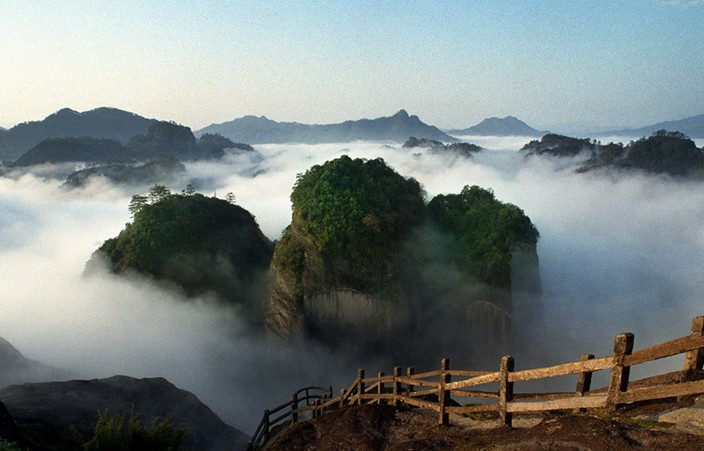 隱屏峰由茶洞從峰南壁攀登即可登臨,因峰巒方正如屏,故名。峰西有一尖銳直上且半腰有橫裂三痕的奇石即為接筍峰。隱屏蹬道極為險峻,號為“雞胸”、“龍脊”,原為明代道士汪三寶、劉端陽所開鑿。峰頂有玄元道院、清微道院遺址,還有仙凡界、仙奕亭、南溟靖諸勝,古代號為“隱屏真境”。峰南的平林渡畔有朱熹構筑的“武夷精舍”遺跡。往峰頂向東盤繞,向北可至天游,版權所有山東聊城聊之旅國際旅行社有限公司,轉載必究!由東南而下則可至仙釣臺下。