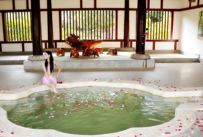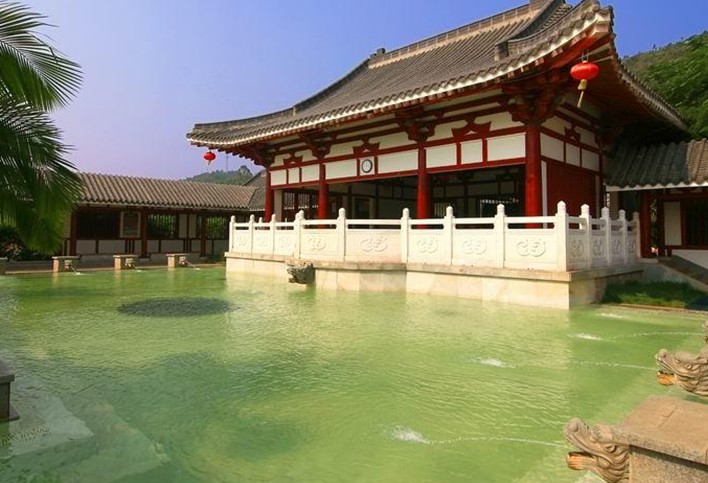 龍?jiān)礈厝燃俪俏挥趽碛小皽厝肌泵雷u(yù)的河源斷裂地帶的中段,背靠由珍貴的水晶石構(gòu)成的“水晶山”,溫泉水從地下100多米深處透過(guò)古老的水晶巖層涌出,水質(zhì)更具靈性,富含40多種礦物質(zhì),硅酸、鋰、鍶、鋅、二氧化碳等珍貴地?zé)岬V泉水。龍?jiān)礈厝燃俪菗碛?3 個(gè)純天然泉眼,勘測(cè)日流量近萬(wàn)噸,溫泉水資源十分豐富,最高溫度68℃,具有良好的增強(qiáng)免疫力,活化細(xì)胞,養(yǎng)顏瘦身等保健療效。