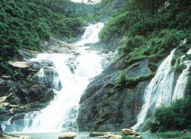 湯泉風景區最有名的當數九龍潭瀑布。溫泉西北的咫尺之遙,上蒼再顯神靈,又施仁愛,拋下一串“珍珠”———九龍潭瀑布,它在群山深處奔突而出,拾級而下,一步一潭,至山底第九潭,但見奔雷飛雪而落,蛟龍騰空而降,終聚九龍潭瀑布。溫泉和瀑布這一暖一涼,地下天上,遙相呼應,交相輝映,這在現代林林總總的人文景觀大家族中,可謂鳳毛麟角。