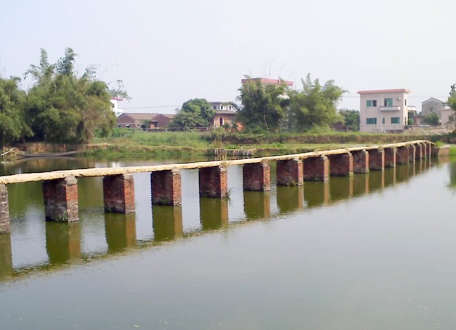 沿著彎彎的鄉間小路,可來到古勞水鄉一處名叫“二渡橋”的地方。只見前面的圍墩上,有幾棵百年老榕,靜靜地鎮守和護衛著這一方水土。榕蔭下,幾塊長條花崗巖石條曲曲折折地架在魚塘邊的木樁上,頗有一種“小橋流水人家”的韻味。這種花崗巖石條,當地人稱它“條石”或“西樵石”。因水鄉的泥土細滑,不易滲水,偶爾幾滴小雨,這里便遍地泥濘,行走不便。于是居民們便用這種“條石”沿著小河涌和糖基鋪路,形成了遍布水鄉的石板小橋和石板小路,構成一幅獨特的風景。