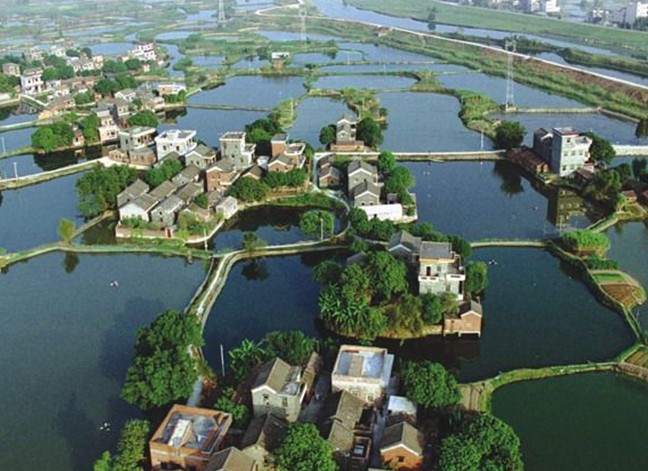 古勞堤內水網縱橫交錯,小艇穿行如梭,兩岸蕉林搖曳,萬畝魚塘似明鏡耀目,千頃桑地綠海翻波,那青青的田疇就像精雕的翡翠,好一派旖旎的南國水鄉風光。
