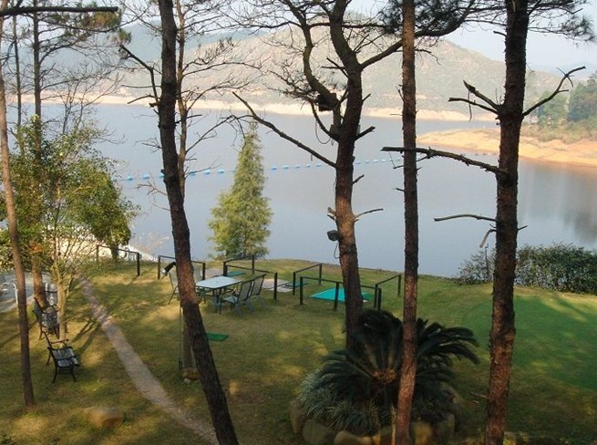 河東名人山莊的高爾夫球練習場就建在湖邊的懸崖上,揮動球桿,小小的高爾夫球成拋物線狀優雅地降落在碧綠的湖水里,這種妙不可言的感覺吸引了我們這幫從來沒有接觸過高爾夫球的門外漢。球場旁邊有一片松樹林,林中設有秋千和吊床,睡在吊床上,靜靜地透過高高的松樹看著潔凈如洗的藍天白云,只見遠處山頂一堆蘑菇云慢慢地被風吹著一路往山莊方向飄來,由厚變薄、由濃變淡,漸漸地變成羊毛般的云絮,隨著溫暖的春風飄舞浮動,直至飄散、消融。在乒乓球臺前、網球場里,經過一輪大汗淋漓的運動之后,再跳進了碧綠的游泳池,一種清涼舒適的感覺必定涌上心頭。