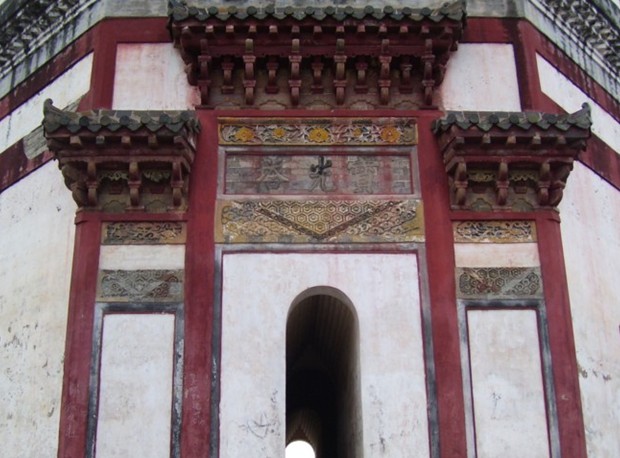 寶光塔塔門用磚雕圖案裝飾,門額上方用磚雕陰文橫書塔名“寶光塔”。塔名右上方有兩行豎書陰文款,分別為“分守嶺西道政朱東光”和“參政徐大任”;塔名左下方有陰文豎書落款“萬歷丙子仲春建”。