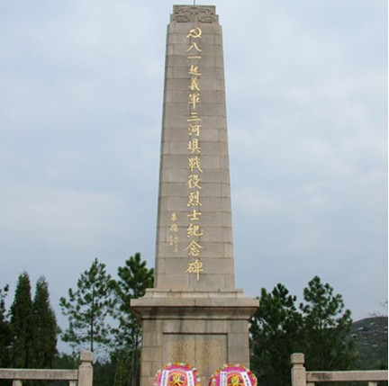 三河壩烈士紀(jì)念碑位于汀江、梅江和梅潭河三江匯合的三河壩。三河壩群峰對(duì)峙,地勢(shì)險(xiǎn)峻,是水陸交通要沖,歷來(lái)為兵家必爭(zhēng)之地。南昌起義軍曾在朱德的率領(lǐng)下在這里與國(guó)民黨錢大鈞部激戰(zhàn)了三晝夜,許多戰(zhàn)士犧牲在這晨。1964年當(dāng)?shù)卣谌訅螙|岸的筆枝尾山頂建造了15米高的紀(jì)念碑,后來(lái)又在左邊建了紀(jì)念亭,現(xiàn)已列為廣東省重點(diǎn)文物保護(hù)單位。