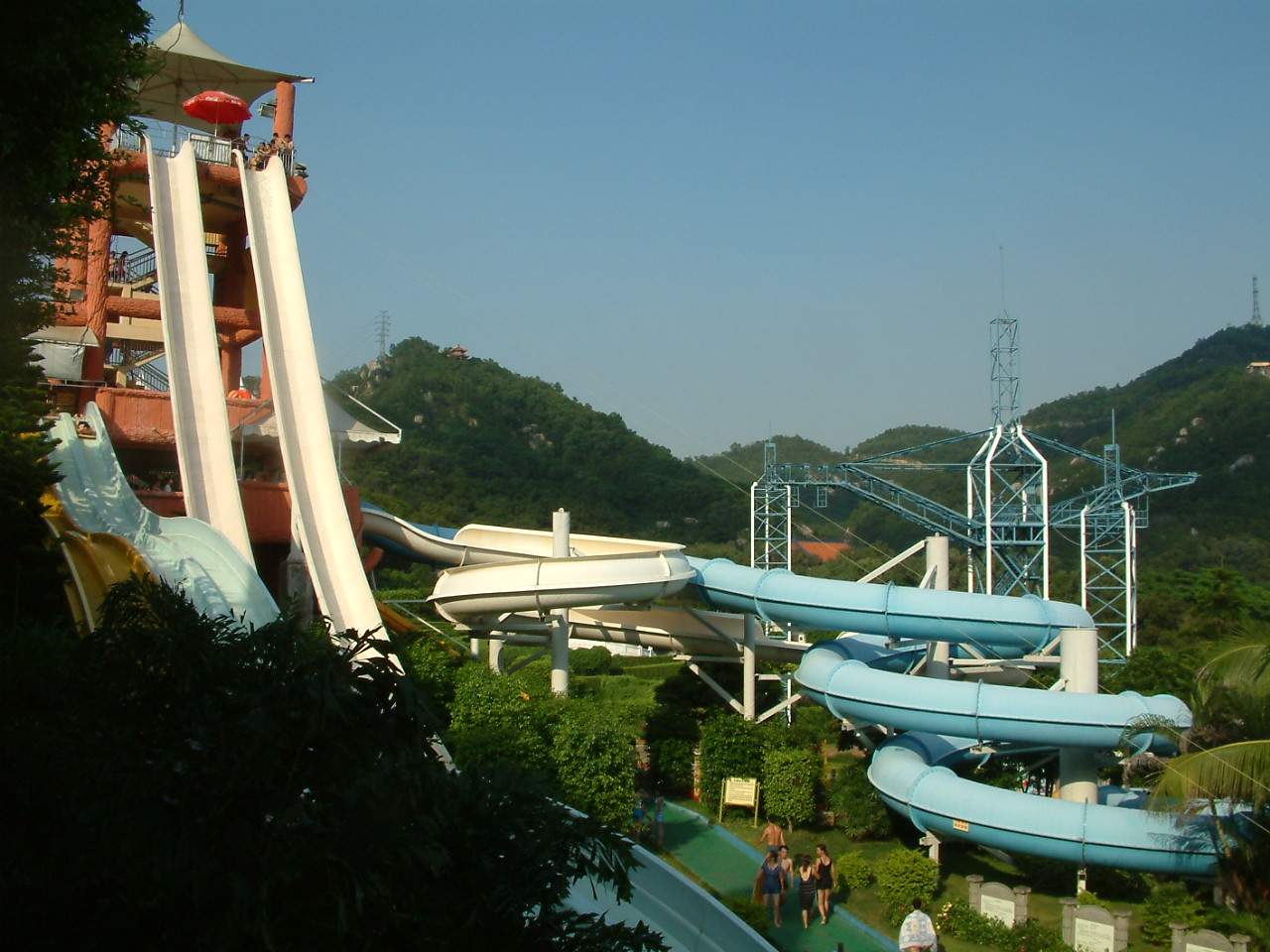 一千零一夜――滑道區。包括平等競賽滑道、螺旋滑道、大型俘筏水滑道和高速滑道。其中高速滑道是兩條并列的高達8層的樓高的高速滑梯,從頂端滑下來僅需2.6秒,頗有從云端滑落的感覺。