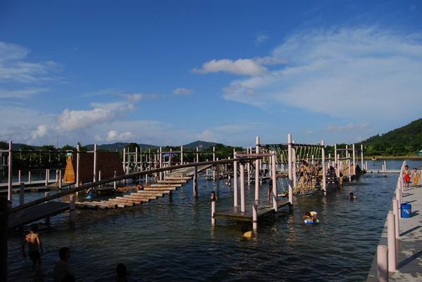 三疊泉是珠海橫琴島上的名泉,泉水自市區最高峰腦背山(458米)由上而下疊成的瀑布——大狹瀑——飛凌瀑——隱靈瀑飛流直下而得名,山澗有許多的清澈的溪泉,山腳下更有可以暢飲的山泉泳場,它一鵝卵石砌岸鋪底、泉水自進自去、活水泳場清爽暢快。并有一個1.5萬平方米的大型沙灘泉水泳場,泉水有兩種水溫,上暖下涼,這就是最獨特之處。海島少有清洌的甘泉,而三疊泉竟能成瀑、成潭、成泳場、既可觀、有可飲、可游樂、是島上一絕。