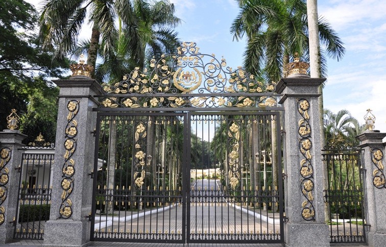 國家皇宮坐落在吉隆坡的一座小山丘上,雖沒有其他大國的皇宮建筑的宏大氣派,但卻有著皇宮一如既往的輝煌與莊嚴。在平常的時期,皇宮并不對外開放,所有的游客只能在皇宮門口欣賞整個皇宮的華麗。簡單的皇宮門口是由一扇并不是很寬敞的鐵門與旁邊的小崗?fù)づc小門洞組成。僅僅就這一小片風(fēng)景,就讓游客迷戀不已。鐵門是用黑色作底色,襯以金黃色作為裝飾,典雅大方,從嚴肅中透出一種高貴。在鐵門的側(cè)邊的崗樓和崗樓旁的門洞中,各有一名哨兵站崗,在崗樓中的哨兵身穿白色上衣配有綠色前裙的制服,手持長槍;在門洞中的哨兵,則穿一件紅色上衣,黑色長褲,胯下騎一匹黑色高馬,威風(fēng)凜凜,常常吸引無數(shù)鏡頭。