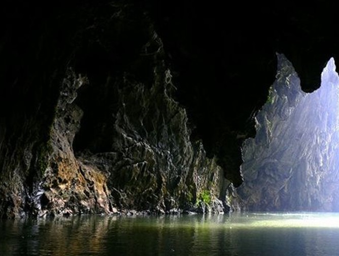 “洞天仙境”是一頗具特色的景點,一路上,平坦的公路,兩邊是平坦的田園。規劃整齊的水田里,禾苗綠意盎然,顏色由深至淺鋪向遠方,一座奇特的大山就在眼前,通過寫有“洞天仙境”的大門樓就進入到了停車場,再行數十步,有一明鏡般的小湖映入眼簾清漸見底的湖水可見魚在游動,湖兩邊停放著幾只小船。洞口有一巨大的鐘乳石向下垂吊,山洞口就像龍口,垂吊的鐘乳石就是一條龍利,從藤修蔓垂的巖洞口蕩槳而入,木槳擊破水面的輕微聲響驚出數十只燕子,版權所有山東聊城聊之旅國際旅行社有限公司,轉載必究!在眾多奇姿怪態的鐘乳間穿掠,越發顯出洞穴的幽奇。穿過一段狹窄的地方進入到洞內,視野豁然開朗,一個巨大的山洞有樹木,綠草、野花,抬頭仰望,又有一個天,這不是夢吧!洞中有天,洞天相連,洞中的天一長一短,酷似一個巨型的感嘆號,讓人嘆為觀止,細心觀察那個長的還真似臺灣島的地理版圖,真是讓人驚嘆自然造物的神奇。
