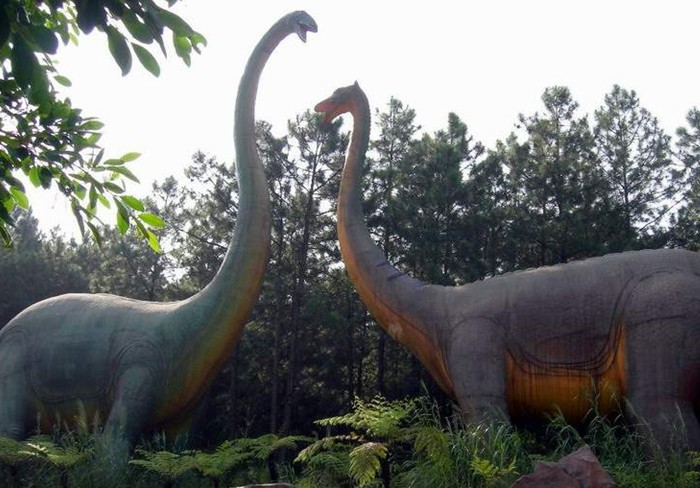 按照1:1的比例設計制作的兩條仿真恐龍栩栩如生。較高的是梁龍,身體背部為綠色,尾巴特別長達16米,脖子也接近13米長,身體總長達40米,身高達22米,堪稱目前世界上最高、最大的仿真恐龍!在它旁邊的身高稍矮、體型稍小一點的巨龍也并不能小看,棕黃色的身軀也有18米之高,體長近40米。