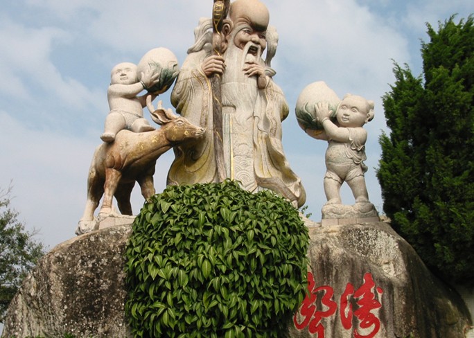 島上有兩座建于元、清的天后宮,故稱媽嶼。碼頭邊的海面上,有一塊黑褐色的浮石,據說是當年媽祖普渡漁人化神入海時留下的,叫“媽印石”。島上最高處海拔41米,成了海灣大橋的天然橋墩。山上一座高大的觀音塑像,目視著大橋上的過往車流,向人間揮灑著祝福的甘露。