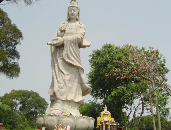 它落成于1994年5月29日,雕藝高超,面容端莊,惟妙惟肖,其左手拿甘露瓶,瓶口向下;右手執柳枝,拈露灑人間,形象動人。這座高達12米(含蓮座2米),由總重10多萬公斤108塊石雕砌成,當時是由市工藝美校設計,惠安縣石雕高手刻后遠途載來。其左豎一石燈。又有冊形石板刻著詩僧定持所書二詩,韻妙墨妍。