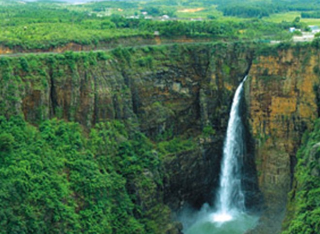 峽谷頂部地貌平緩,壺口瀑布從200多米的懸崖峭壁飛流直下,形成了氣勢磅礴的山水奇觀。另有一條坡度達50度斜角的1386級石階的“通天梯”可達谷底。峽谷溝壑縱橫,奇峰林立,古木參天,構成一幅巧奪天工的山水畫卷。