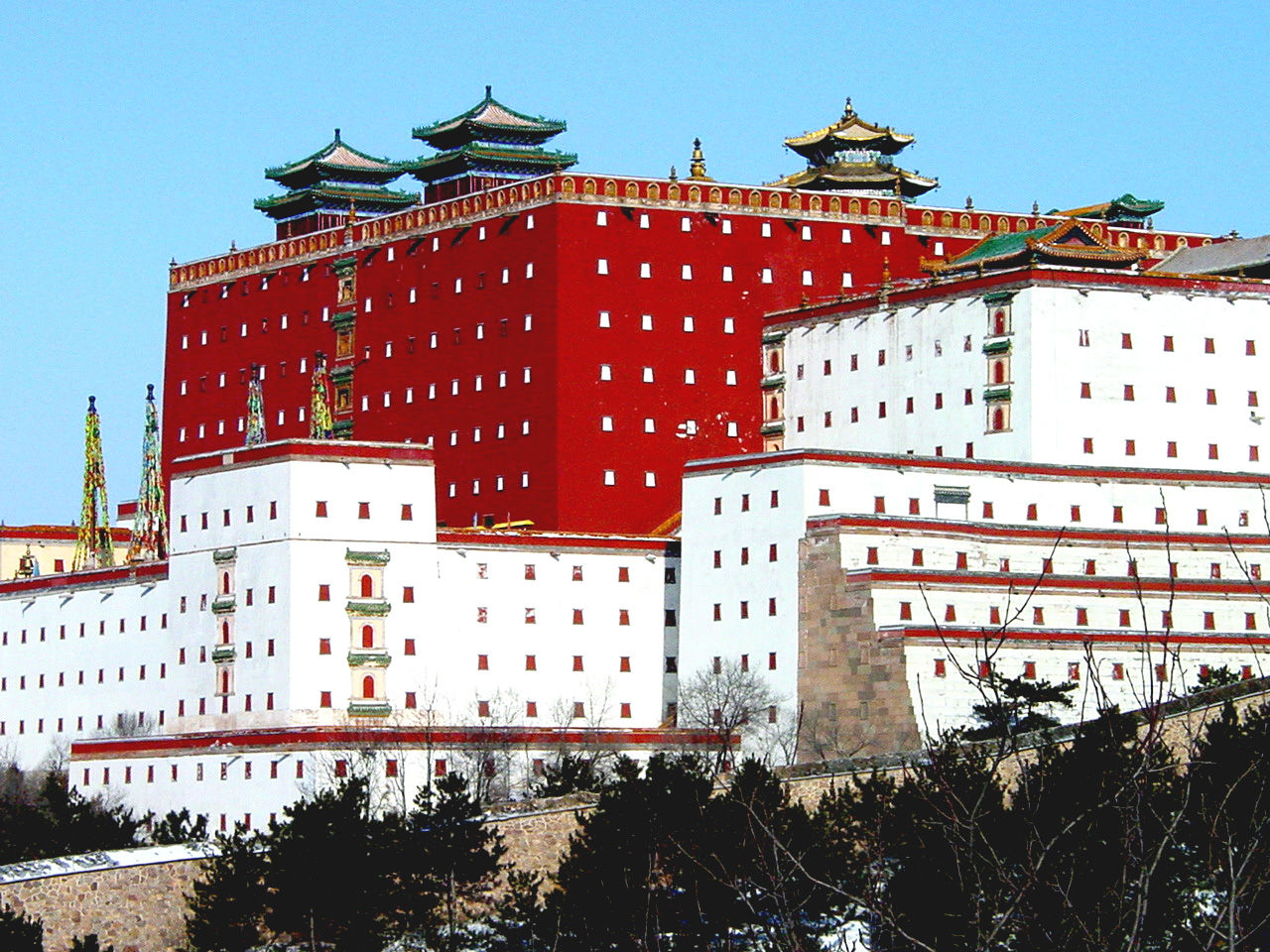 大紅臺南、第一部分兩側(cè)散置30余座大小白臺,成“×”形不規(guī)則布置。白臺分殿臺、樓臺、敞臺、實臺,形狀不一,體量不等,功能各異。層高一至四層,二、三層者居多,大都白灰抹面,青磚鑲邊紅色盲窗,琉璃砌頂,版權(quán)所有聊城聊之旅國際旅行社有限公司,轉(zhuǎn)載必究!上檐挑出淌水長瓦。白臺為藏式平頂?shù)锓啃沃疲ㄖ脻h族磚混結(jié)構(gòu)法式。有的兩座白臺組合成一處院落作僧房;有的臺上建漢式殿堂,作佛堂、鐘樓使用;有的臺頂置舍利塔;有的白臺砌成實心,只起障景增景及點綴作用。白臺群總體效果表現(xiàn)了西藏布達(dá)拉宮前山腳下梵字的特征。南部宮墻兩頭分置角樓,實墻白臺砌盲窗,頂部起雉堞。宮墻兩側(cè)白臺中間辟門,上起廡殿,對稱配置,供僧人進(jìn)出使用轉(zhuǎn)經(jīng)桶。
