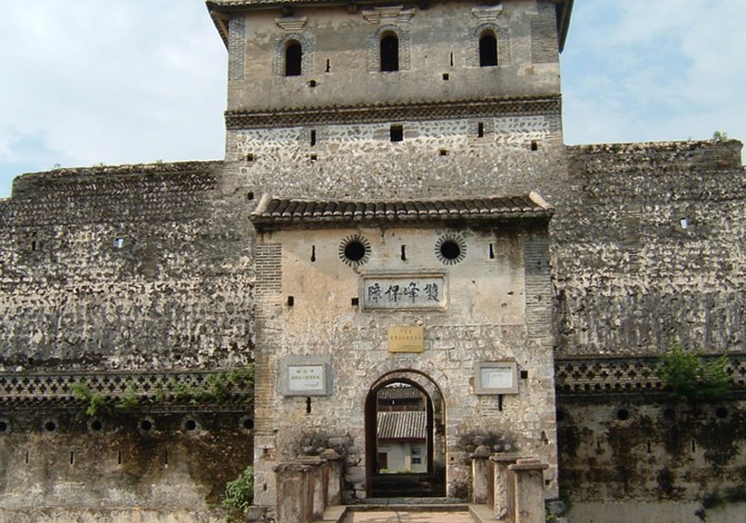 古城堡內(nèi)攻、防、守相結(jié)合的設(shè)計環(huán)環(huán)緊扣,以一個主樓(也稱中樓)和四個炮樓為主軸,東西兩面城墻中間各有個瞭望臺,其間用圍墻相連。主樓為五層,高15.3米,四個炮樓比主樓稍矮,為13米,圍墻四面以走馬廊相連,廊分兩層,底層寬3.15米,可用作住戶,據(jù)稱可住千人;上層寬1.2米,聯(lián)通包括主樓在內(nèi)的五個炮樓,值此守望相助。走廊每隔3.9米有一小炮眼,共有55個小炮眼,炮眼居高臨下,從不同角度可消滅不同方向來犯之?dāng)场?/p>