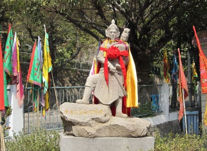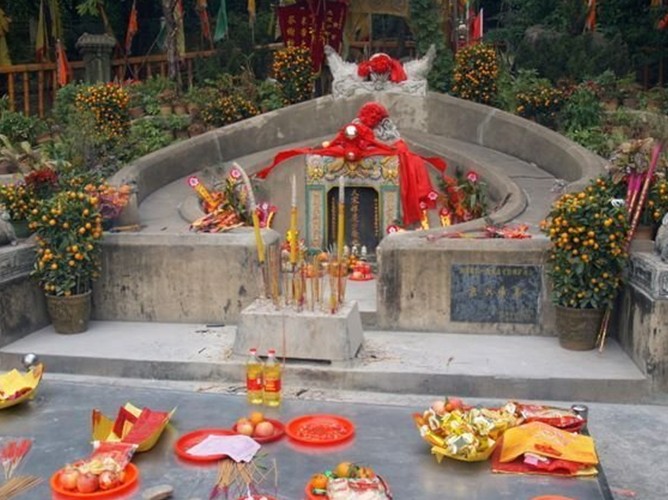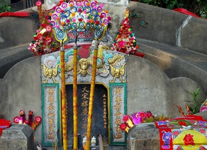 碑后為墳堆,有兩重弧形圍墻,前段中間頂面塑祥云拱月,涂染朱紅,后段頂面塑雙龍拱日,下有一只鳳鳥裝飾。墓的東側,立有一塊泉州白石碑,正面是《宋帝昺陵墓碑記》,記敘了宋少帝的生平、陸秀夫負帝殉海的經過以及陵墓的修建情況,碑文為篆體陰文,風格古拙,是著名書法家商承祚所寫。石碑背面則刻有著名書法家秦萼生題筆的八個大字:“崖海潛龍,赤灣延帝”,字體蒼勁。陵墓西側,版權所有山東聊城聊之旅國際旅行社有限公司,轉載必究!是一座高約四米的陸秀夫負帝殉海石雕像,民族英雄陸秀夫背負幼主,視死如歸,凜然正氣,令人肅然?;蛟S,正是陸秀夫這種寧死不屈的民族氣節的感召,不時還有世人前來拜祭。在少帝陵前,在陸秀夫像前,擺滿了豐盛祭品,縈繞著裊裊香煙……
