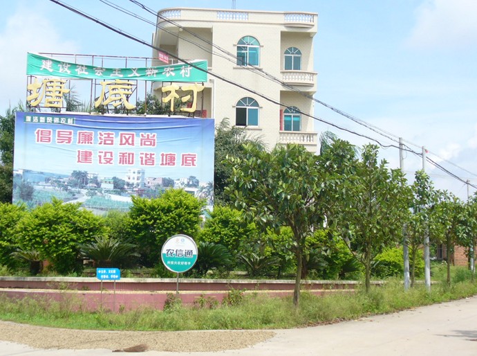 塘底村地處新民鎮西北部,全村現有人口1182人,耕地面積490畝,種果面積450畝,2005年實現人均純收入達3000多元。近年來,該村致力把村容、村貌環境建設作為新時期農村工作的首要任務來抓好,高標準、高起點建起了初具規模的生態文明新農村。至2005年底止,全村共投資280多萬無,清除雜竹1200多叢,28000多根,清理雜屋80多間,1500多平方米,推土8000多立方米,填污水塘5個,建設環村道5.8公里,建設文化樓一幢,燈光球場一個,大舞臺一個,種植大王椰108棵、蘇鐵106棵、黃金梅球88個、黃皮果苗1600株、草皮1000平方米,綠化面積達3900平方米,房屋門前硬底化面積3500平方米,從而使整個村莊的精神面貌煥然一新。該村在抓好生態文明村建設的同時,著力抓好社會治安綜合治理和民主法制教育以及反腐倡廉教育,村中無打架、斗毆、吸毒、賭博,無重大刑事案件發生。近年來,該村先后被授予廣東省文明村、廉江市生態文明村、無毒社區、安全文明小區和湛江市優秀安全文明小區、湛江市民主法治示范村等光榮稱號,是省、市反腐倡廉教育進農村示范點。