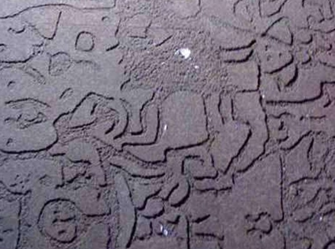 寶鏡灣摩崖石刻畫,位于廣東珠海市高欄島寶鏡灣,于1989年10月被發(fā)現(xiàn),共4處6幅,散布于海灣所在的山腰、山麓200米范圍內(nèi),其中最大的一幅長5米、高3米。巖畫陰刻于大塊平整的石面上,圖案密集而復雜,形狀有船、波浪、龍蛇、舞蹈人等,經(jīng)專家考證,是距今二三千年前青銅時代的產(chǎn)物,是南越先民生活的寫照。