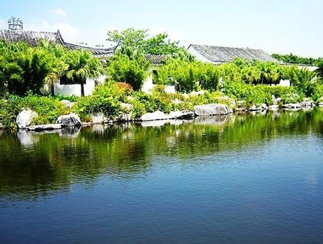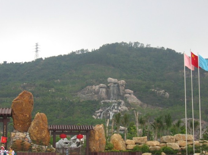 由我國園林名石——廣東英石、江蘇太湖石以1:1000倍比例按廣東嶺南派著名畫家林風(fēng)俗教授的水墨山水名畫——“天下第一盆景”為藍本放樣砌成。