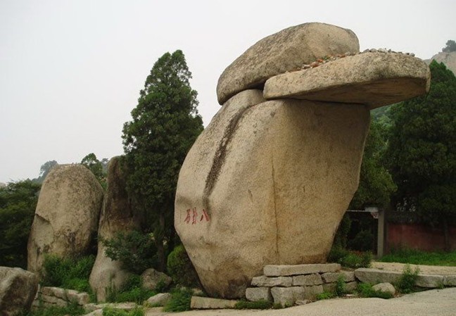 八卦石 八卦石是古代嶧山的五大奇觀之一。奇就奇在這兒原來有八塊大石頭,由東向西依次排列,高度相當,每塊石面都有斷紋。八塊石頭的斷紋正好與《周易》八卦的卦爻相吻合。非常可惜的是,清雍正四年(1726年)修奎星閣毀掉了幾塊石頭。嘉慶十二年(1807年)拓建通明天宮戲樓,又毀掉了幾塊石頭?,F在只能看到乾、坎、艮三卦的卦爻了。