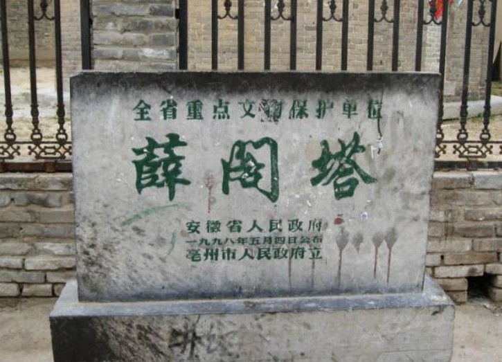 薛閣塔在安徽亳州老城東南,是一座磚塔。直椎式八角開,共七層,高34.15米,周圓23.36米。塔座由八塊青石奠基。塔一二層為仿木結構,每角砌磚為方柱,高3.5米。柱上仿高50公分。仿上為塔檐、上并飾以斗拱、昆蟲、鳥卉花紋,登塔門面向東北,有螺旋式臺階,塔室為一個面南的小龕,可能是供俸神象用的,現空無一物。