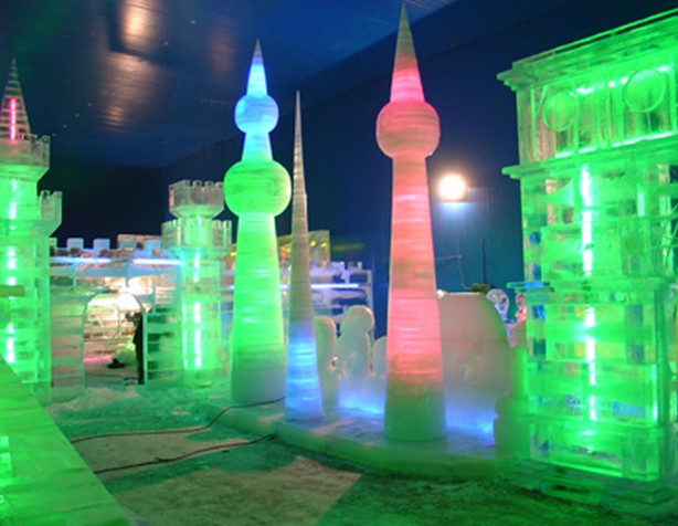 現代獨特的冰質造型藝術與冰景造園藝術,是冰城人開發利用冰雪資源最為突出的成就之一。它以松花江天然冰、自來水和各種電燈為材料,用砌筑、堆壘、雕刻、噴澆、冷凍和鑲嵌等方法,根據特定的主題需要和總體布局安排,在不同的園林空間加工出有關的冰景,冰建筑、冰雕塑、冰 瀑布、冰花壇、冰滑梯、冰書法、冰盆景、冰廣告、冰凍花、冰罩燈,組成若高低錯落、疏密有致的不同景區,形成步步有景、步移景易的冰雪園林,同時配置各種燈光,增加動的成份,輔以音響效果,達到形、光、動、聲的和諧統一。冰燈藝術是以冰為載體,以燈為靈魂,融繪畫、雕塑、建筑、園林、文學、音樂等多種藝術于一身,并可運用光學、力學、聲學及電氣、機械等科學技術的新興的造型藝術。運用這種藝術形式創造出的珠宮琳館、瓊榭瑤橋、銀雕玉塑、冰山雪嶺、冰凌冰瀑,白晝間千姿百態,晶瑩剔透,入夜后流光溢彩,萬紫千紅,象撲逆迷離的仙山瓊閣,似如夢如幻的水晶宮闕,且年年出新意,歲歲景不同,被稱為"永不重復的童話世界"。冰雕,即是冰燈中的一個品種,又是一種獨立的藝術形式。哈爾濱每屆冰雪節期間,都要分別組織職工、家庭、少年兒童和全國中學生以及國際性的冰雕比賽,比賽產生的數百件作品姿態各異,生動傳神,巧奪天工。