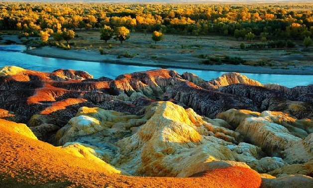 五彩灘位于布爾津縣城以北約24公里處,是前往哈巴河縣與喀納斯的必經之路。它毗鄰碧波蕩漾的額爾齊斯河,與對岸蔥郁青翠的河谷風光遙相輝映,可謂“一河隔兩岸,自有兩重天”。激猛的河流沖擊以及狂風侵蝕,形成了北岸的懸崖式雅丹地貌,河岸巖層抗風化能力強弱不一,輪廓便會參差不齊,而巖石含有礦物質的不同,又幻化出種種異彩,因此得名“五彩灘”。 版權所有聊城聊之旅國際旅行社有限公司,轉載必究!而南岸卻是綠樹葳蕤,連綿成林,遠處逶迤的山巒與戈壁風光盡收眼底。