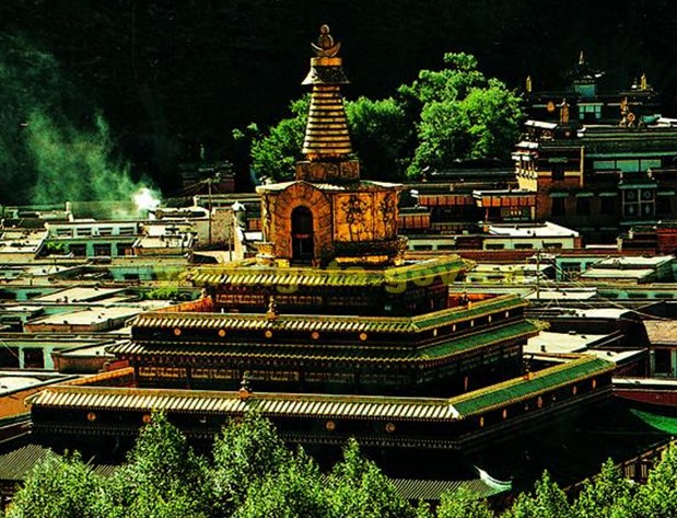 拉卜楞寺西南角,由三世貢唐倉•貢曲乎丹貝仲美大師建成于1805年,原名現見解脫大金塔,因塔內供有從尼泊爾迎請來的無量光佛(阿彌陀佛)像而享譽海內外,寶塔造型別致,工藝精巧,在建筑藝術與宗教意義上達到了完美神圣之境界。現存寶塔由六世貢唐倉•丹貝旺旭大師為丕振宗風,宏教利民,而于1991年2月8日在原寶塔遺址舉行凈地儀軌,主持籌建。工程竣工于1993年7月,于佛祖釋迦牟尼初轉法輪的殊勝節日舉行了開光永存儀式。貢唐寶塔高五層,31.33米,塔呈菩提式,版權所有山東聊城聊之旅國際旅行社有限公司,轉載必究!占地2144.16平方米,由塔剎、塔瓶和塔座組成。塔剎是日、月、星辰;塔瓶是精銅浮雕鎏金八大菩薩;塔座是琉璃瓦裝飾的三層四角形建筑。寶塔外形金碧輝煌,氣勢非凡,內部構造精巧,多寶嚴飾。塔內正中是二層相互貫通的四座佛殿,供歷世貢唐倉靈塔或木雕鍍金像,并藏有兩萬余卷佛經。殿頂供阿彌陀佛、二世嘉木樣和千佛銅像。貢唐寶塔與大夏河水、云杉禪林相映,矗然傲立,巍峨壯觀,現已對游人開放。