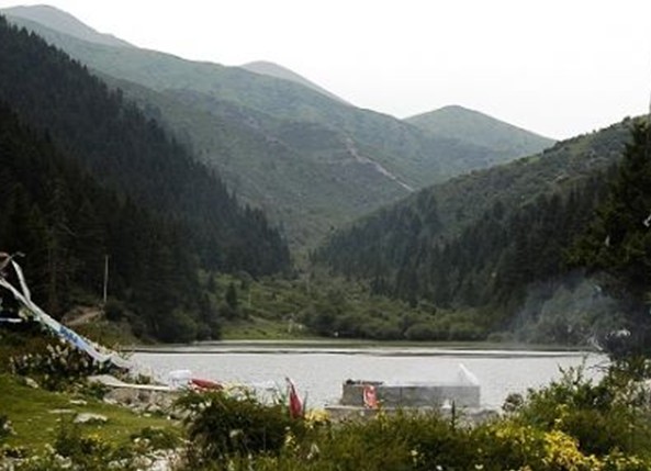 位于王夏公路約10公里處,距縣城17公里,是一潭構造成因的斷崖地形之湖盆。湖面海拔三千米左右,呈狹長形,湖濱周圍怪石嶙峋,虬松四出。湖南北長約350米,東西寬約百米,面積約有五十余畝。湖濱地形開闊,外圍前塬是平壩草甸,三面環山,山上森林密布,林中百鳥群集,湖中魚類繁生,湖畔野草叢生,百花盛開,湖光山色,令人陶醉。人們形容達宗湖象一顆鑲嵌在密林幽谷里的明珠,在高山峽谷之巔放射著耀眼的光芒! 達宗湖是附近群眾尊奉的“神湖”之一,湖畔前塬、箭桿林立、經幡飄舞。每逢六月,各地香客絡繹不絕地來到這里朝圣插箭。這時,整個山巒香煙繚繞,海螺聲聲,響徹云霄。男男女女手轉經輪,口誦經文,按順時針方向繞湖三周,然后投擲寶瓶,祭祀神湖,以求神靈保佑,祈愿五谷豐登,人畜兩旺。 達宗湖不僅是高原優良的牧場,也是水鳥群集的天然樂園。