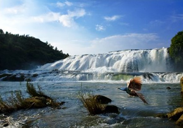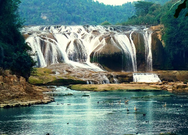 平水時,白水河流量不大,水流清澈,陡坡塘瀑布顯得十分清秀嫵媚。瀑布水層沿著和緩的瀑面,均勻地撒開,在一鱗鱗的鈣華灘面上輕盈地舞著,如一層薄薄的、半透明的面紗,又如一面面張開的素絹扇面,在陽光下泛著銀光,故有人戲稱為“新娘面紗”。但當洪季來臨,白水河水由于攜帶了大量由洪水沖下來的上游泥沙而呈黃色的濁流時,陡坡塘瀑布便消失了往日平水時的秀色,而變得異常兇猛雄壯。黃濁的河水翻壩跌落,摧王搗冰,像一匹脫韁的野馬,且瀑布左側的鈣華堆積而成的洞穴,版權所有山東聊城聊之旅國際旅行社有限公司,轉載必究!在巨量洪水經過時會產生奇特的汽笛效應,發出低沉渾厚的吼叫聲,故陡坡塘瀑布又稱為“吼瀑”。在陡坡塘瀑布的東側山崖上,有一條小瀑布從蘆葦叢中飛瀉而下,還不等水流至地面,瀑布已散成層層水霧,從小瀑旁經過,只見晴空綿雨,橫飄亂揚,并在陽光下折射成美麗的彩虹。修長清秀的小瀑與寬闊雄壯的陡坡塘主瀑形成一種強烈的對比,但似乎又和諧地組合在一起,這種瀑布組合亦是不常見的。陡坡塘瀑布的另一特色是在瀑下發育很寬闊平坦的灘面。灘面上遍布數十個大小不同的小碧潭,碧潭淺者只有數十厘米,深者可達數米。碧潭中還藏有魚蝦,故當地布依族人常手執網兜,去捕撈潭中的小魚蝦。在雨季時,水流量奇大。陡坡塘瀑布還是拍攝西游記結尾時唐僧師徒走過的瀑布。