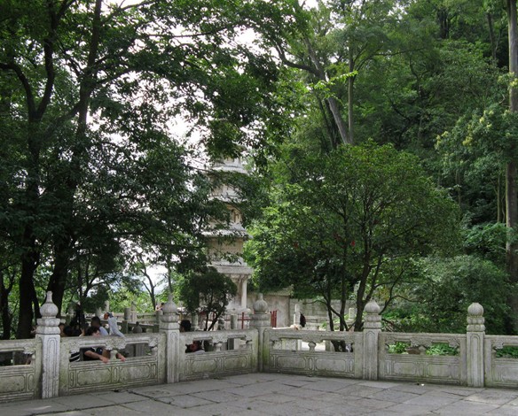 大殿后有一高臺,前立二碑,乃朱德、董必武游黔靈山詩碑,碑后石壁嵌有多塊鐫刻,撰者為乾隆初年云貴總督吳達菩、貴門州巡撫劉藻、赤松和尚等。弘福寺不僅殿樓林立,還間有“風尺亭”畫廊、“月明池”、“生生泉”“望城臺”等。寺后毗盧峰下有塔林,為弘福寺歷代祖師及僧人、居士之靈骨安藏處,有名可考者計有赤松、瞿脈、參之、惺慧、光燦、弗云、湛然、柏青、心月、智明、慈云、覺崇。