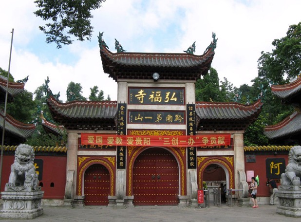 弘福寺位于貴陽市黔靈山群峰中心,距城約1。5公里,是十方叢林,為貴州首剎,向有“黔南第一山”之稱。弘福寺于1672年(清康熙11年)由赤松和尚開創,“弘福”二字乃“弘佛大愿,救人救世;福我眾生,善始善終之意。赤松是為本寺開山始祖,佛法為臨濟一系之正宗,乃禪門五宗之一。