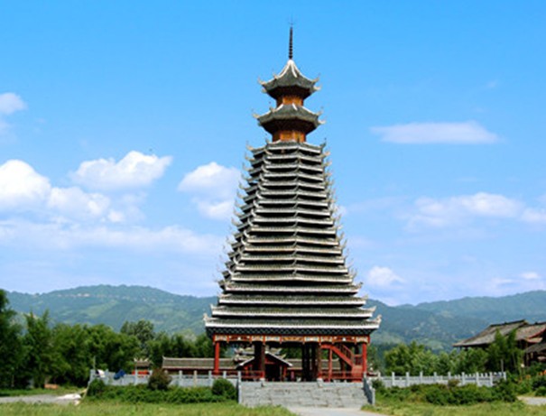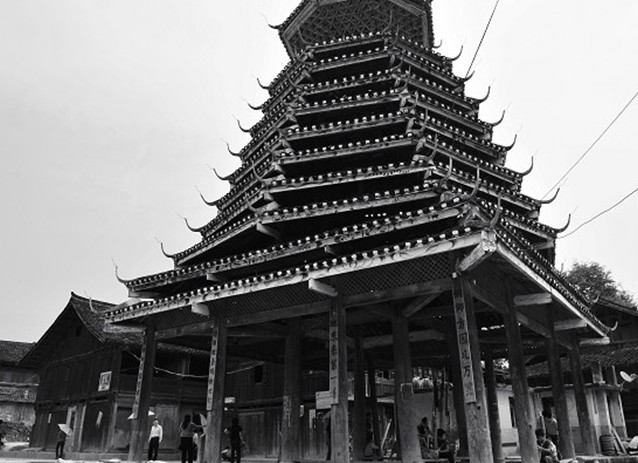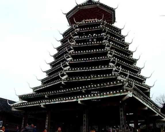 紀(jì)堂鼓樓位于貴州省黎平縣肇興鄉(xiāng)紀(jì)堂寨上,共3座。十分雄偉壯觀(guān),1982年,紀(jì)堂鼓樓被列為省級(jí)重點(diǎn)文物保護(hù)單位。紀(jì)堂分上寨下寨,各有一座鼓樓,由十二根大杉樹(shù)原木支撐而起。塔身分八角,而頂層卻變化為四角攢尖頂花重檐。鼓樓周?chē)牡孛婧兔窬拥淖叩郎隙家月咽偳冻上笳飨矐c吉祥的圖案。紀(jì)堂鼓樓建筑年代久遠(yuǎn),曾多次修葺。