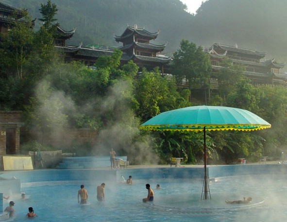 劍河溫泉為國內稀有的氡硫溫泉,日涌水量1800 噸,富含氡、硫、鐵、鉀、鈣等元素,其理化指標與法國著名的維稀溫泉相似,有消毒、去疾、健膚之功效,常浴可治療和預防多種疑難病癥,自古享有 “苗鄉圣水” 、“西部浴都”之美譽。1989年,在這里開發為現代化的溫泉浴場,里面有一幢內設鴛鴦浴池、桑拿浴池、美容廳的“舒樂”健身房,還有4個露天浴池,其中有為當地苗族同胞享用的露天浴池,上邊的是男池,下邊的為女池,(他)她們至今還保持著原始古樸的裸浴習慣。裸浴,在(他)她們看來,是一種自然現象,無須顧忌,對偶然出現在浴池邊的外地人,版權所有山東聊城聊之旅國際旅行社有限公司,轉載必究!只要你不是在有意偷看,(他)她們會毫不在意。