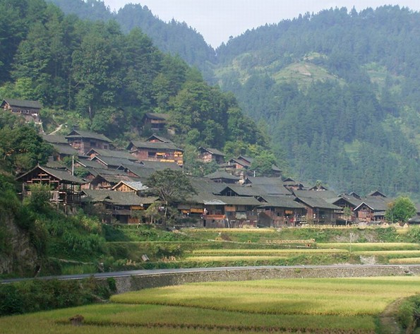 郎德上寨四面群山環繞,村前是一條清澈見底的溪流,流入美麗的丹江。跨溪有風雨木橋,沿溪有石磨碾房,水中群鴨嬉戲,兩岸水車成行。寨子對面有養流坡,坡腰有8畝許平地和一長150米的賽馬跑道。每年農歷三月馬日,雷山、凱里、麻江、丹寨四縣交界的苗族男女青年,在此舉行爬坡活動,對歌,賽馬,盛極時達萬余人。郎德上寨民居依山而筑,為木質結構吊腳樓。有五條花街路通向寨中。東、西、北面置有木柱瓦頂護寨門樓,簡稱“寨門”。寨上,吊腳木樓,鱗次櫛比,錯落有致。版權所有山東聊城聊之旅國際旅行社有限公司,轉載必究!寨中道路、院壩及各戶門庭,都用鵝卵石或青石鑲砌鋪就。寨中有兩個銅鼓、蘆笙場。場子模仿古代銅鼓面太陽紋的圖案,以青褐色鵝卵石和料石鋪砌成十二道光芒,朝著十二個方向伸展。銅鼓、蘆笙場的兩頭,用鵝卵石、水泥鑲嵌成兩匹飛奔的駿馬。