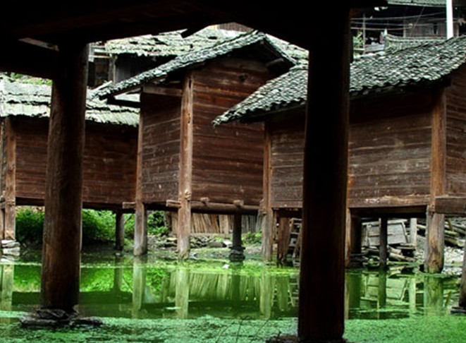 新橋苗寨是性感超短裙苗之鄉(xiāng)。新橋的苗族女人通常穿一種僅長5-7寸的百褶裙,被人戲稱為“超短裙”。具體的穿法是,平時穿兩條裙子,節(jié)日盛裝的時候穿三四條裙子,但不管穿多少裙子,長度總也不會增加;裙子里面穿窄腿長褲或打綁腿,裙子外面罩有花圍腰和花彩帶;上身多是繡花衣、對襟衣,衣服上的刺繡花樣多為蝴蝶花紋。她們的“唐朝發(fā)式”也很有意思。將頭發(fā)梳成大髻,再用大木梳固定聳于頭頂,和唐代壁畫上的仕女非常相似。一走進寨子最先注意到的便是這里的“水上糧倉”。為了防火、防老鼠和防螞蟻,保護糧食,新橋把糧倉都建在寨中的水塘上,一家一戶一座糧倉。
